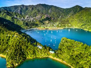 59618OP00-Ngakuta Bay nestled in Grove Arm. Aerial view over houses in forest near Ngakutu Point, and yachts and vessels moored in the bay. Queen Charlotte Drive. Marlborough Sounds, Marlborough District, South Island, NZ
